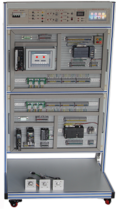 采用立式網(wǎng)孔板結(jié)構(gòu),由工業(yè)鋁型材搭建而成,上方為電源控制模塊,下方為網(wǎng)孔式安裝板。底部設(shè)有帶剎車萬向輪,方便移動布局。臺架尺寸約為1000×800×1800mm。 頂端電源模塊,提供實訓(xùn)所需的三相交流380V、單相220V電源接口,具有啟動、停止、急停系統(tǒng),設(shè)有漏電保護、電源指示、過流保護等功能。設(shè)有DC24V控制電源,配有控制開關(guān)及輸出接口,帶短路保護功能。 |