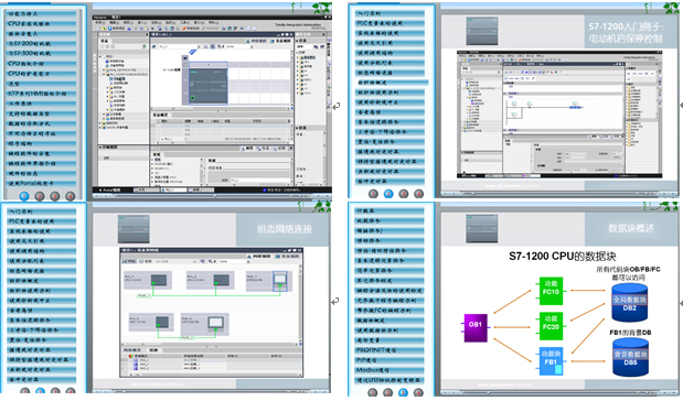 配有S7-1200 PLC學(xué)習(xí)軟件,方便老師教學(xué),提供有功能與特點、模塊安裝、選型、工作原理、支持的數(shù)據(jù)類型、數(shù)據(jù)的存取方式、程序結(jié)構(gòu)、編程軟件的安裝、編程軟件界面介紹、硬件的組態(tài)、入門實例、PLC變量表的使用、使用交叉引用、組織塊使用示例、基本位邏輯指令、上升沿-下降沿指令、置位-復(fù)位指令、接通延時定時器、比較指令、移位-循環(huán)移位指令、基本邏輯運算指令、數(shù)據(jù)塊概述等50多個學(xué)習(xí)項目。PLC學(xué)習(xí)軟件參考界面如下: