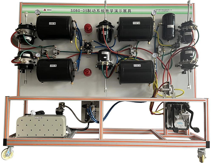1.臺架上具有的全新天錦EQ1120GA原車零部件有空氣壓縮機總成、空氣干燥劑、前橋儲氣筒、后橋儲氣筒、手制動儲氣筒、再生儲氣筒、輔助儲氣筒、四回路保護閥、制動腳閥、駐車閥、ABS電磁閥、繼動閥、制動管路、氣壓表若干個。