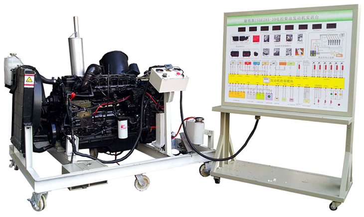 柴油發(fā)動機(jī)總成、組合儀表、發(fā)動機(jī)控制單元、散熱系統(tǒng)(水箱、風(fēng)扇、上下水管)、排氣系統(tǒng)、進(jìn)氣系統(tǒng)(進(jìn)氣軟管、空氣濾清器總成)、原車電路原理圖板及檢測端子面板、蓄電池、電源總開關(guān)、燃油箱、油水分離器、油門踏板裝置、可移動機(jī)臺架、臺架高溫及轉(zhuǎn)動等部位加裝防護(hù)裝置等。