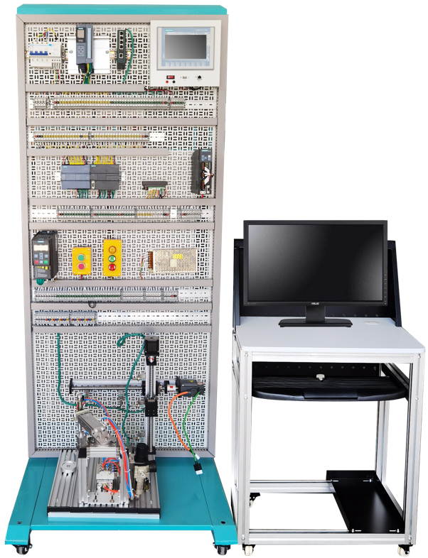3)電氣控制系統(tǒng)開放式工業(yè)機架結構,含成套器件;面板采用網孔板形式,4 只萬向輪(2 只帶剎車)?蓪 PLC、電源、變頻器、觸摸屏等安放在該平臺上,配有空氣開關、接線端子、電纜線、輔料,接地可靠,設有漏電等保護裝置,安全性符合相關的國標標準,保護學生在實訓過程中的安全性。采用工業(yè)規(guī)范制作,所有接線有標號,便于實訓和日常維護。