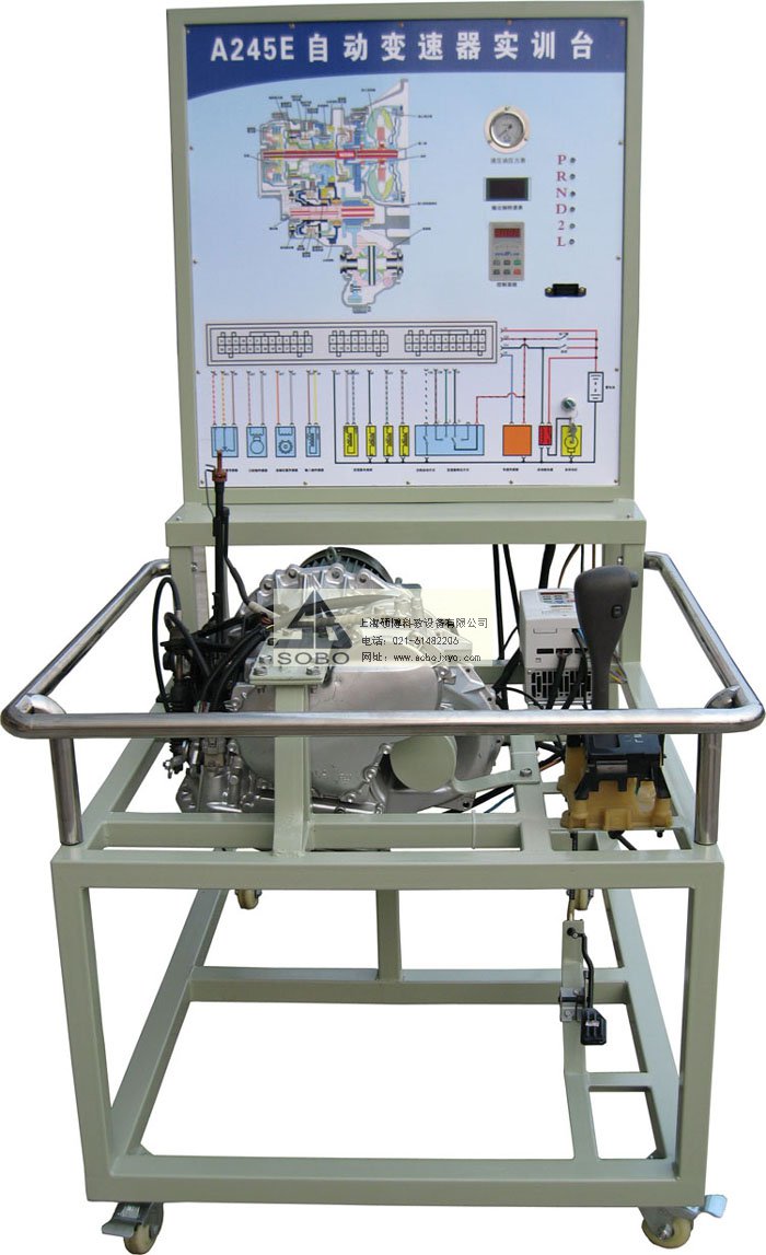 本變速器實訓臺是本公司采用一汽豐田自花冠動變速器為適應汽車教學需求而研制的,該實訓臺由電控變速器(八成新)、操作顯示面板及發(fā)動機彩色電氣原理圖電腦控制柜、可移動式臺架(萬向腳輪)、驅(qū)動系統(tǒng)(腳踏式油門踏板)變頻電機驅(qū)動、剎車系統(tǒng)(腳踏液壓盤試剎車)、啟動系統(tǒng)(電門鎖方式啟動)、車速傳感器、電磁閥執(zhí)行器、原車電腦、具有發(fā)動機運轉(zhuǎn)及顯示(轉(zhuǎn)速.車速.檔位)、液壓油壓力顯示表(顯示換檔過程油壓)、自動變速器電磁閥工作指示LED燈、原車OBD-Ⅱ診斷座、故障設置區(qū)可設置12路故障(老師設置任一路線路故障)、故障排除區(qū)(學生通過各種儀器、儀表、)在面板上用專用排故線連接排除故障、傳感器信號模擬等多項功能、具結(jié)構緊湊、操作方便、安全可靠、教學直觀、是汽車自動變速器實物教學不可缺少的實驗室設備之一。