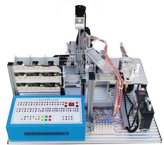 模型底板由10mm厚鋁板加工氧化而成,模型由堆垛機(jī)、立體倉庫、搬運機(jī)械手、稱重加料機(jī)構(gòu)、傳感器、氣缸等組成;所有機(jī)構(gòu)由有1.2mm優(yōu)質(zhì)鋼板加工噴涂制作或鋁材機(jī)加氧化而成,堅固耐用。該任務(wù)堆垛機(jī)有步進(jìn)與伺服控制,負(fù)責(zé)物料的出入倉;機(jī)械手負(fù)責(zé)對物料的加料前后的搬運;稱重加料機(jī)構(gòu)對物料進(jìn)行稱重及加料工作。同時為方便教學(xué),開發(fā)了全開放的任務(wù)接口盒,盒體由1.2mm優(yōu)質(zhì)鋼板加工噴涂制作,面板有鋁板噴涂蝕印沖孔而成,通過并口電纜與智能存儲任務(wù)模型連接,以迭插端子形式開放模型接口,方便實訓(xùn)教學(xué)。