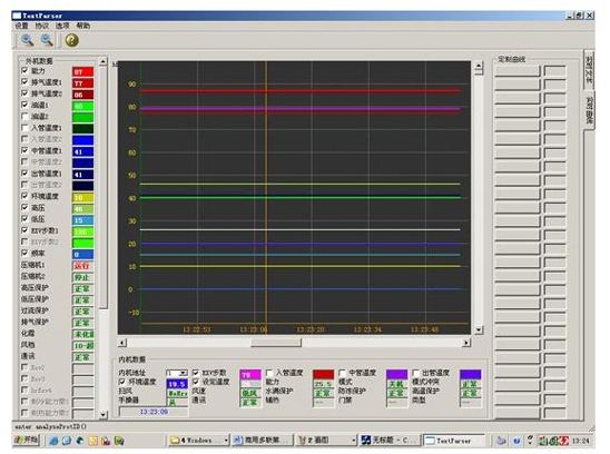 中央空調(diào)機由于工程復(fù)雜,設(shè)備分散,有的已經(jīng)裝修在開花板上測試程序,一但出現(xiàn)了故障,工程量相當(dāng)大,為了能夠快速準(zhǔn)確地測出故障是由主機機組還是室內(nèi)機的故障的,每個生產(chǎn)廠家根據(jù)生產(chǎn)的和維修的需要而開發(fā)了中央空調(diào)測試程序?蓽y試壓縮機的運轉(zhuǎn)頻率,傳感器的各種數(shù)據(jù),電子膨脹閥的工作步數(shù)等幾十種中央空調(diào)的工作數(shù)據(jù)和狀態(tài),軟件可實現(xiàn)對內(nèi)機的控制,,可以對1-64臺內(nèi)機的狀態(tài)進行設(shè)定。是高校提供了好的研究的學(xué)習(xí)設(shè)備。