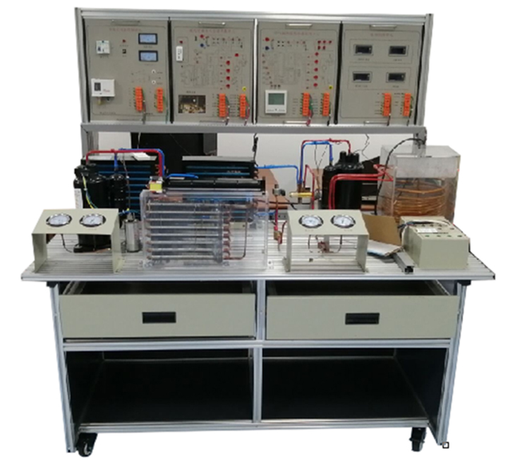 制冷與制熱系統(tǒng)技能實訓(xùn)裝置該產(chǎn)品包含了制冷、熱力學(xué)、傳熱學(xué)和電氣控制等技術(shù),主要由熱泵型家用空調(diào)系統(tǒng)和空氣源熱泵系統(tǒng)兩大部分組成。在鋁合金導(dǎo)軌式實訓(xùn)臺上安裝冷凝器、蒸發(fā)器、節(jié)流裝置、壓縮機、控制電路等,構(gòu)成一個典型的制冷裝置,電氣控制采用掛箱式,能進(jìn)行制冷系統(tǒng)的組裝、調(diào)試、運行,真實呈現(xiàn)制冷裝置的工作過程,通過對制冷系統(tǒng)的安裝、保壓、檢漏、抽真空、電氣連線、加氟、系統(tǒng)調(diào)試及工況調(diào)整等,完成對學(xué)生的現(xiàn)代制冷與空調(diào)系統(tǒng)設(shè)備安裝、調(diào)試和維修技能訓(xùn)練。