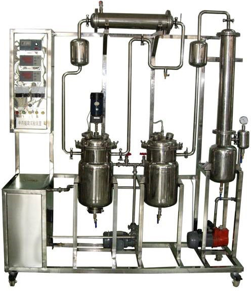 中藥提取實驗裝置由提取罐、蒸發(fā)器、攪拌電機(jī)、列管式加熱器、冷凝器、油分器、收油器、藥液泵、貯液罐、過濾器、真空泵、調(diào)速器、數(shù)顯溫度儀、不銹鋼框架、控制屏等組成。提取罐、蒸發(fā)器配導(dǎo)熱油加熱系統(tǒng),提取罐、蒸發(fā)器頂部蒸汽出口均設(shè)置了除沫器。